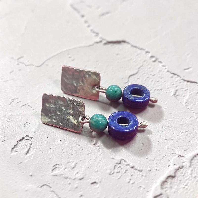 Aros de Plata sólida 950 con lapislázuli y amazonita. Usan tornillo de cierre.
