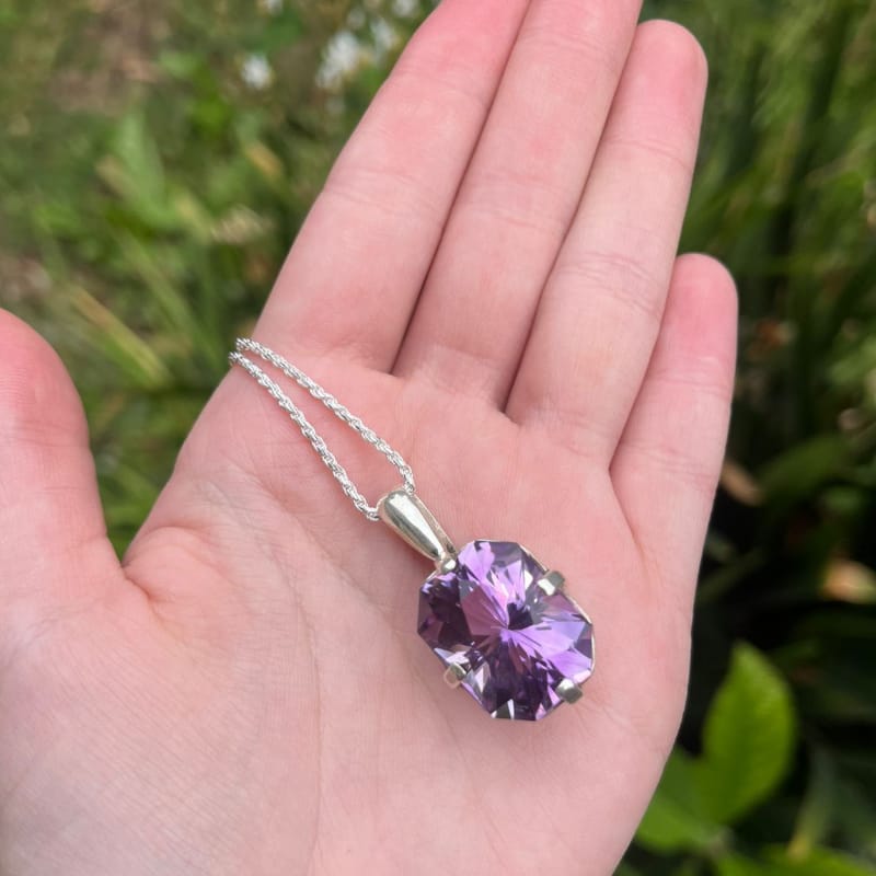Impactante colgante de Amatista AAA+ calidad, facetado perfecto, incluye cadena de plata turbillón de 50 cm de largo.
