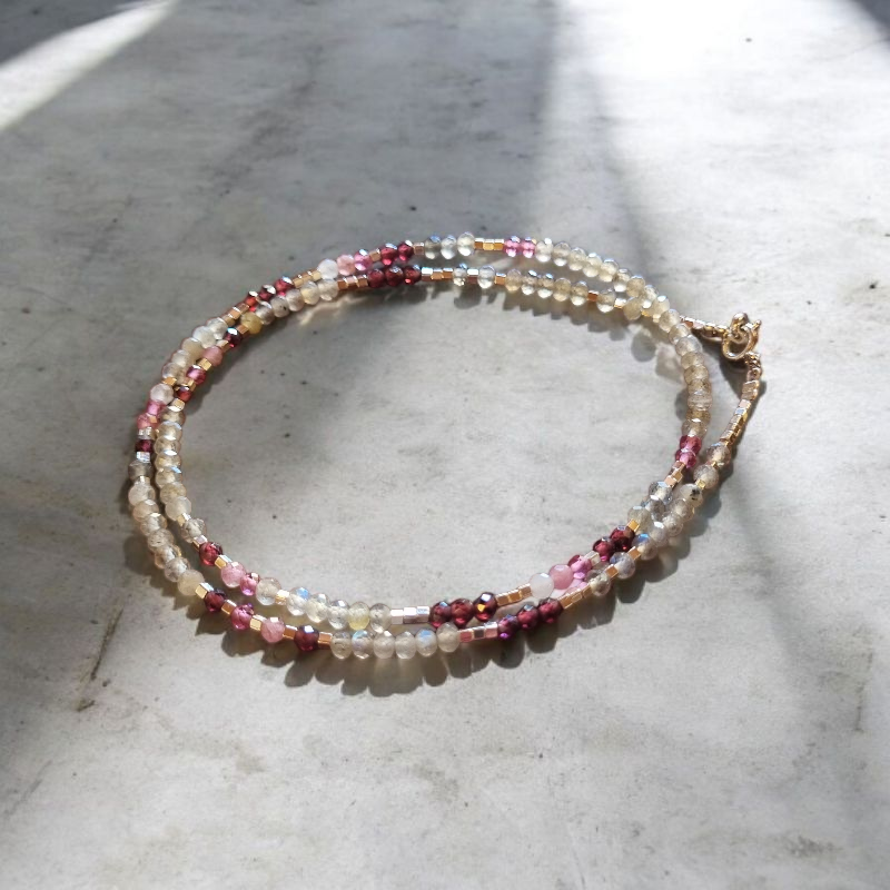 Collar de mostacillas de Plata 950 con piedras naturales, Labradoritas, Granates y Turmalinas. Mide 45cm de largo aprox.