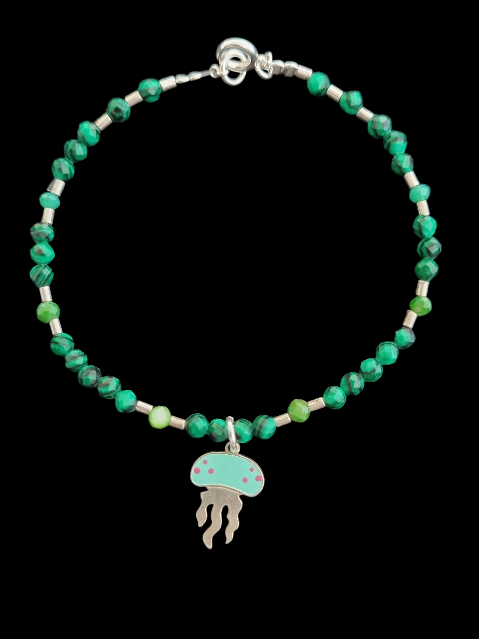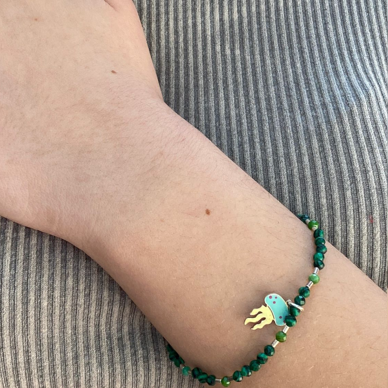 Pulsera de piedras Malaquita y mostacillas de Plata 950, con un adorno dije de Plata y esmalte, mide 17cm de largo