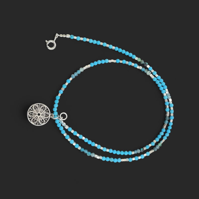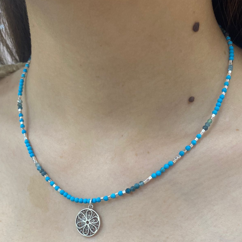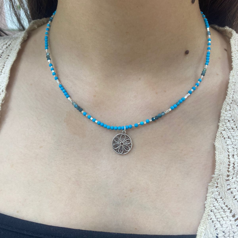 Collar de mostacillas de Plata 950 y piedras Turquesas, mide 42cm de largo.