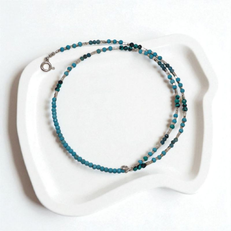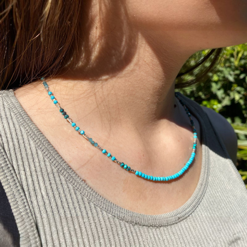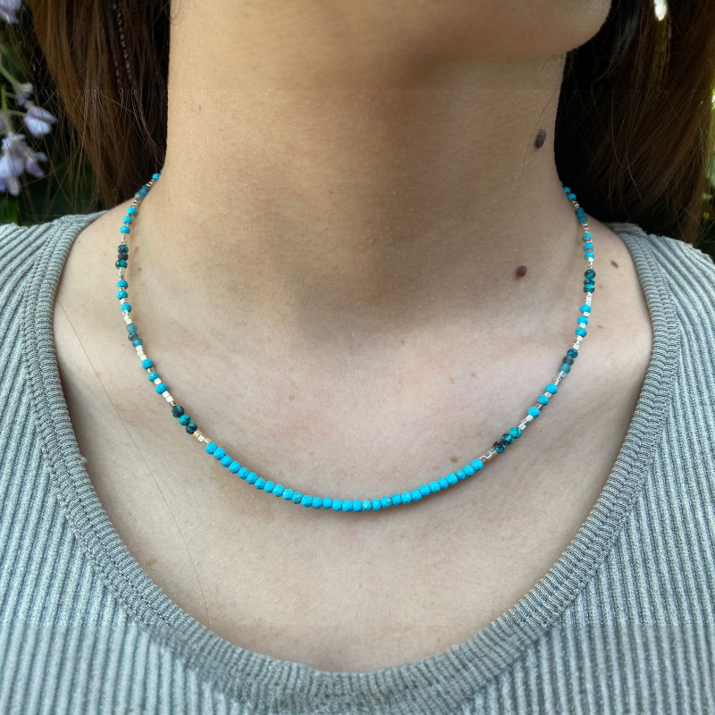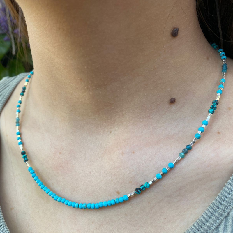 Collar de Turquesas naturales y mostacillas de Plata 950, el collar mide 45cm de largo aprox